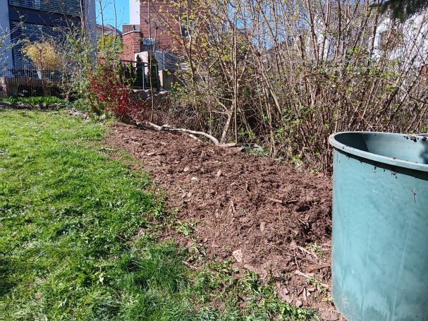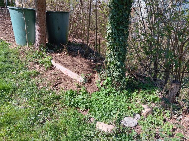 Auf das Ergebnis der mittleren Fläche bin ich gespannt: Dort wage ich ein interessantes Eperiment! Auf diesem sonnigen Platz wuchsen bisher nur Brennesseln und Dornen. Der Boden ist steinig und Humus-arm. Groß graben wollte ich dort auch nicht. Der Hang hinunter zum Hölderweg könnte ins Rutschen kommen. Doch so nah am Haus wollte ich die Unordnung doch nicht haben.