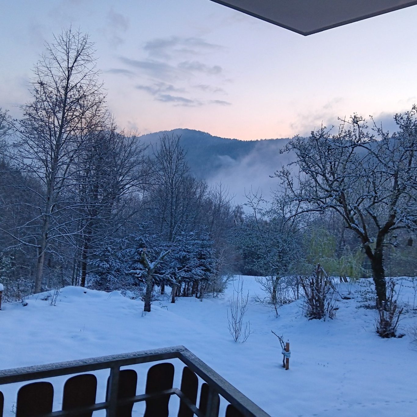 Dieses Bild bot sich mir heute morgen um punkt 6.00 vom Balkon unseres Wohnzimmers aus. Eigentlich ein faszinierender Anblick. Der Nebel über dem Bohrer-Tal, der unbewölkte Himmel und hoch oben drüber der Kybfelsen hinter dem bereits die ersten Sonnenstrahlen hervorblitzen. Zufällig klangen genau zu dem Zeitpunkt von Freiburg her irgendwelche Kirchenglocken. Man könnte auf seine alten Tage glatt noch zum Romantiker werden!