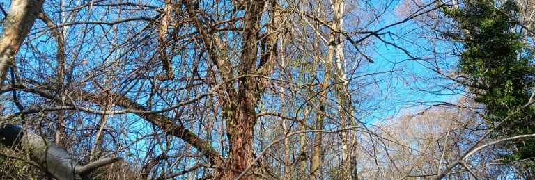 Gestern bin ich nach längerer Zeit mal wieder dahin gegangen. Vordergründig sah ich ein richtiges Chaos. Wildschweine sind dort verstärkt zugange. Brombeeren und dazwischen krumme Eschen, Ahorn, Weiden und Haselnuss. .Die meisten Bäume sind jetzt ausgewachsen. Einzelne sterben ab und fallen um. Viele sind bis in die Spitze mit Efeu bewachsen. Eigentlich müsste ich nach gängiger Sichtweise alles abholzen, das Gestrüpp entfernen und neu anpflanzen. Möglicherweise hätten dann meine Urenkel einen kleinen Nutzen davon.
